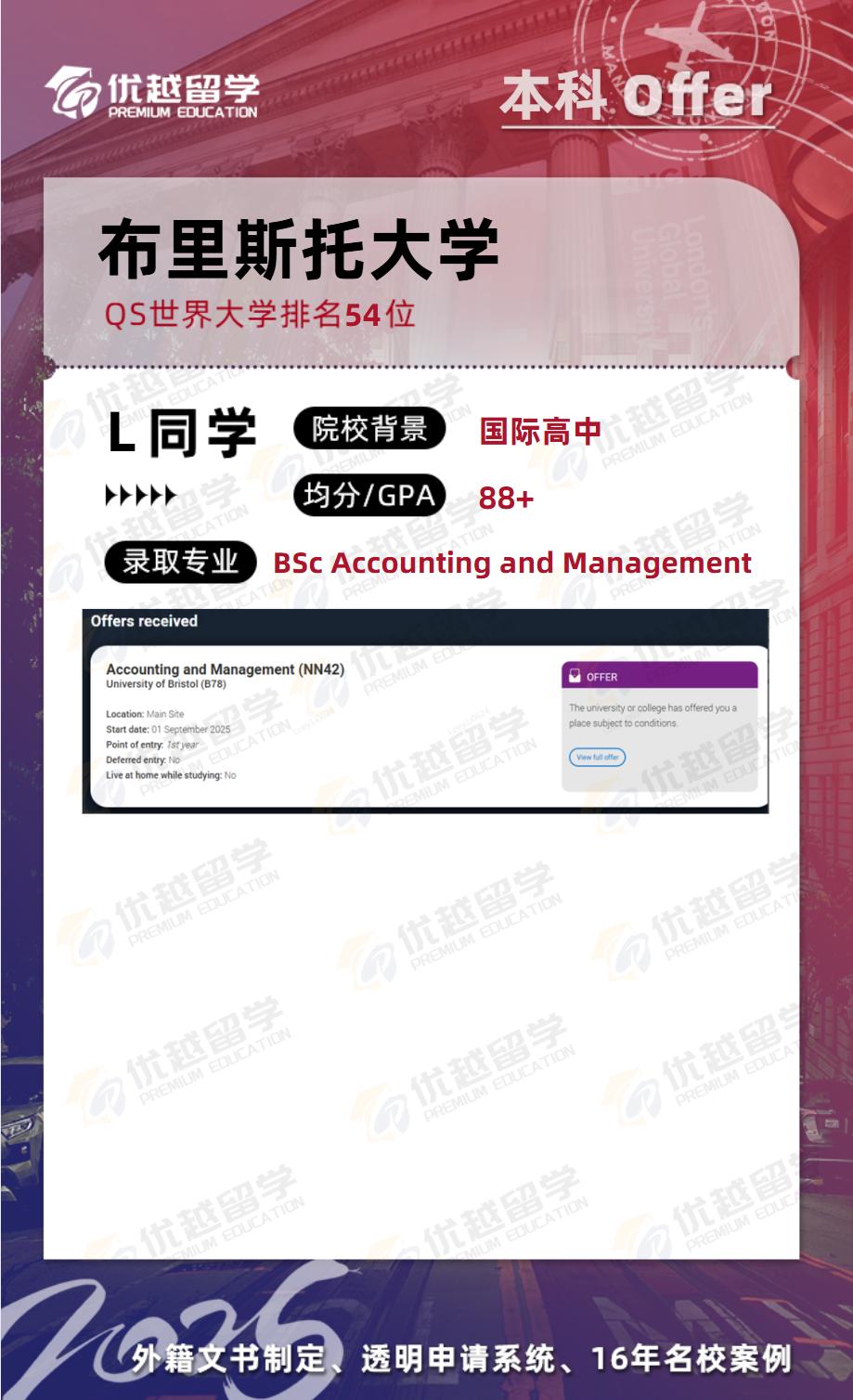 在整個申請過程中,我們始終與 L 同學和家長保持密切溝通,及時調整規劃和策略。終于,好消息傳來,L 同學成功拿到了布里斯托大學offer!成功圓商科夢!我們也祝L同學25fall一切順利!
