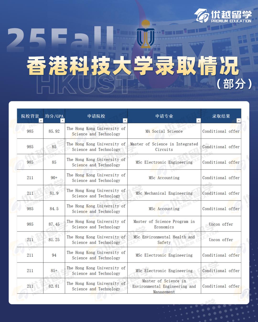 在錄取難度方面,港科技和港大、港中文有明顯不同,它更傾向于錄取 985、211 院校和海外本科背景的學生,雙非院校學生的錄取比例比較低。