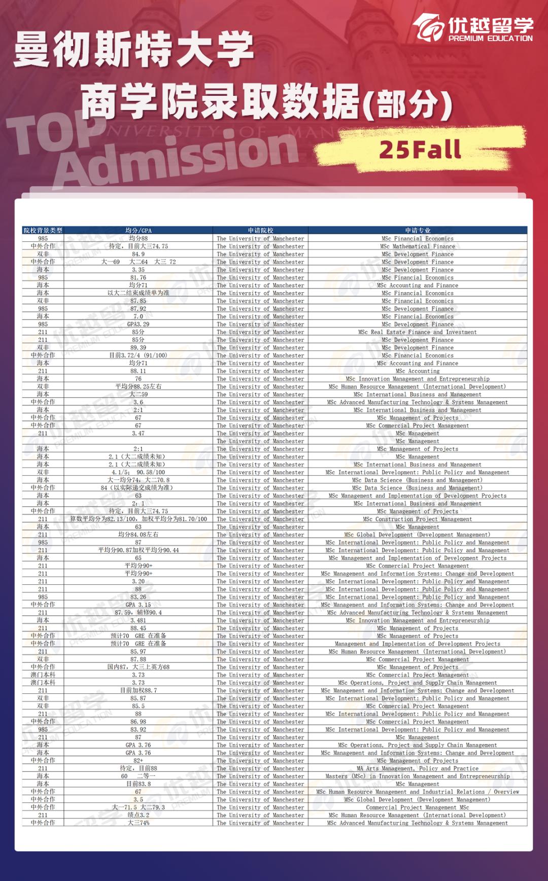 總體而言,申請曼大商學院難度較大,對于 985、211 院校的學生,建議均分達到 87 - 90 分以上;雙非院校的學生被錄取的情況比較少。另外,申請曼大商學院的海本學生很多,再加上學校綜合排名穩定且靠前,使得它成為 “王愛曼華” 商學院中申請難度最高的一所。