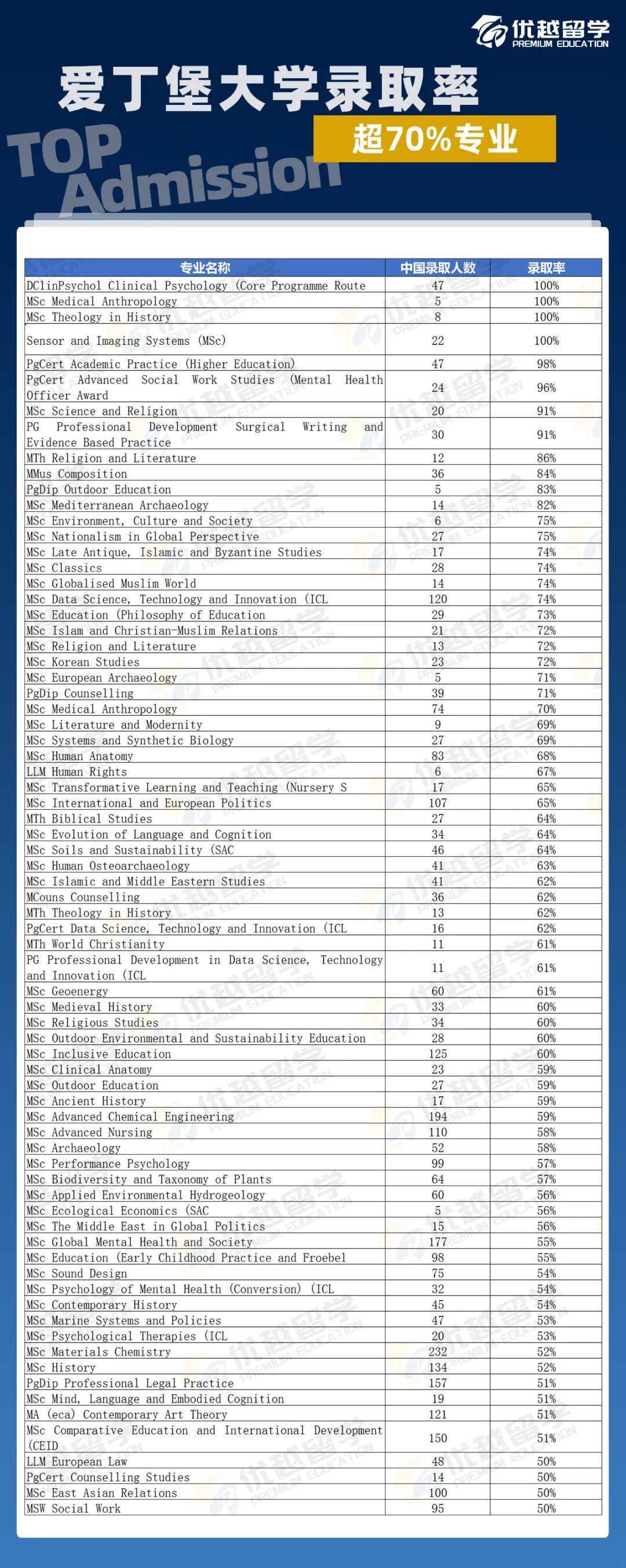 專業優勢:愛丁堡大學在教育領域整體錄取率頗高,通常在 40%-70% 之間。除了全納教育和幼兒實踐專業,像 TESOL、語言教育等專業,錄取的中國學生數量也相當可觀。