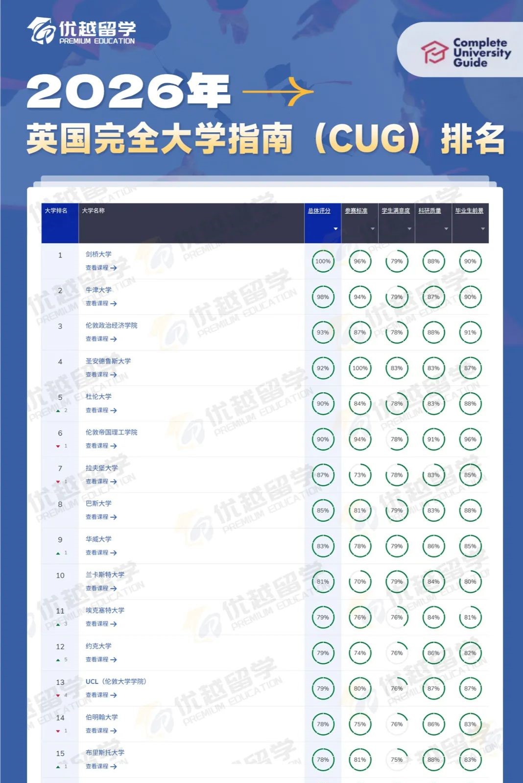 CUG(Complete University Guide)是「英國本土最受信賴的高校排名指南」之一。如果你正打算去英國念本科且有繼續碩博深造的打算,或是畢業后想要留在英國當地工作生活,那CUG排名絕對比QS排名的參考價值要高。