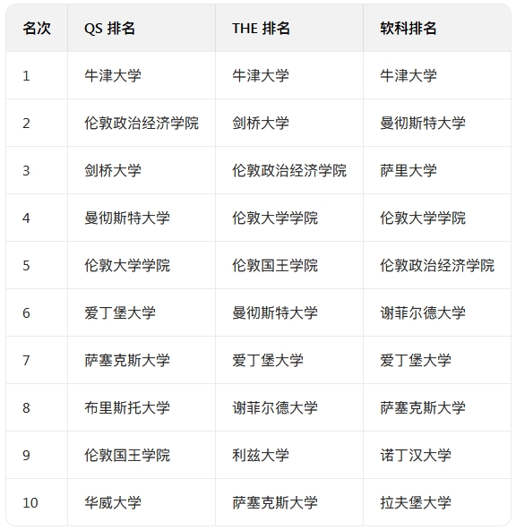 三大排名共同認證:牛津大學、倫敦政治經濟學院(政治學全球第 5)、曼徹斯特大學(社會政策全英前三)、倫敦大學學院、薩塞克斯大學(發展研究全球頂尖)。