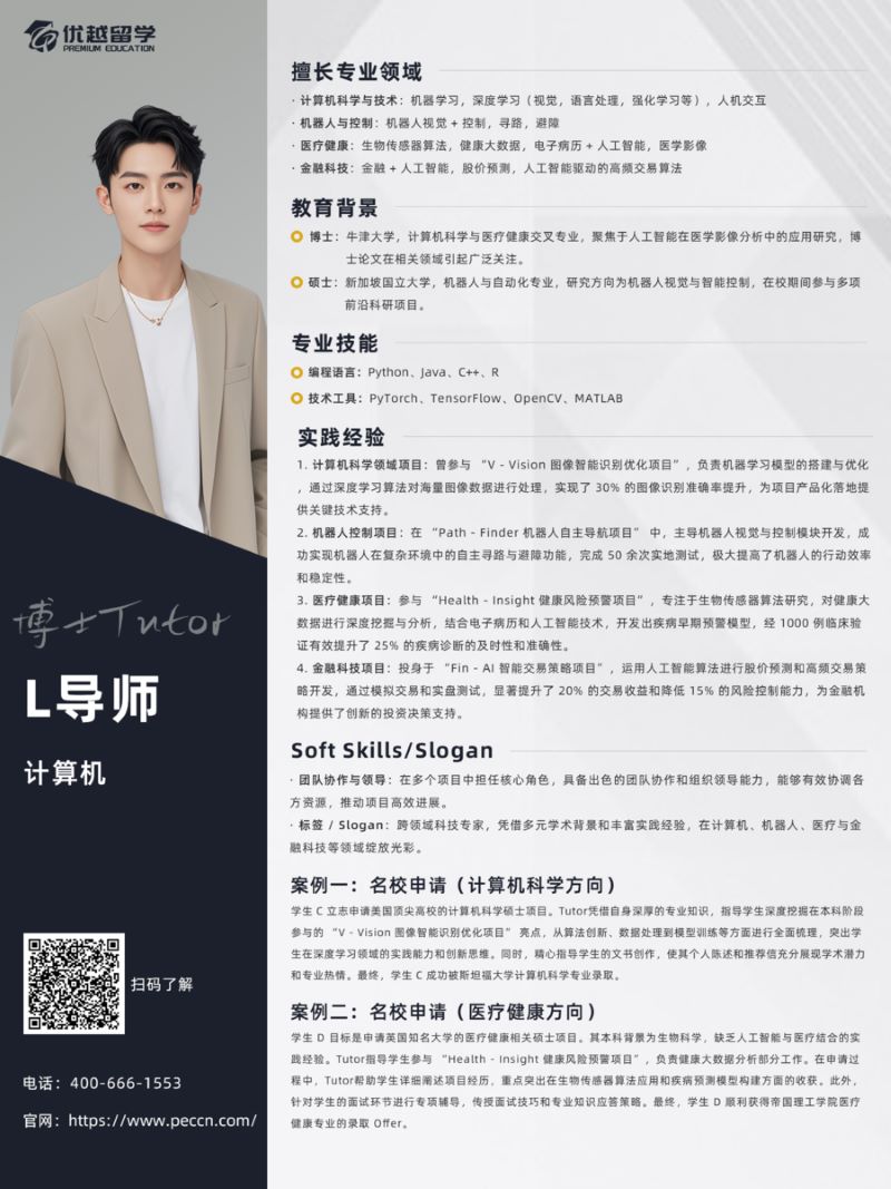 輔導方法:熟悉牛劍招生偏好,幫助學生在簡歷中突出科研成果的量化指標(如 mDice、AUC),并提供劍橋課程與導師研究動態的內部信息,避免申請誤區。