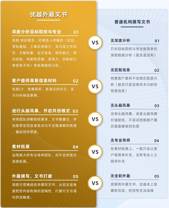 關鍵作用:在當今競爭激烈的名校申請戰場上,僅憑羅列學科成績或簡單的背景信息是遠遠不夠的。沒有專業團隊為你量身定制個性化文書,很難充分展現你的競爭力。優越留學的外籍文書體系,正是為了解決這一問題而生,幫助每一位申請人在眾多競爭者中脫穎而出。