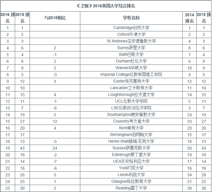 當前位置 :英國留學->英國大學排名->2016 年《衛報》英國大學排名新鮮出爐--優越教育