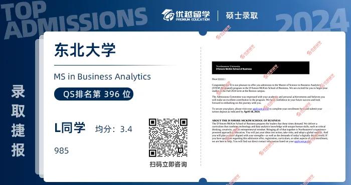 24fall重磅offer來襲!恭喜優越學員L同學順利斬獲美國top名校東北大學錄取,一起來看看吧!