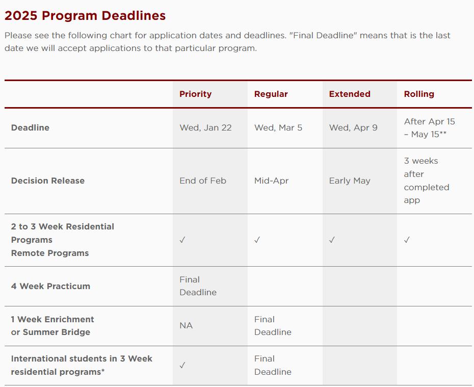 2025 年申請截止時間分好幾類,優先申請在 1 月 22 日截止,常規申請 3 月 5 日截止,延期申請 4 月 9 日截止,4 月 15 日到 5 月 15 日還有滾動申請。優越留學的顧問老師會根據學生的情況,幫助選擇最適合的申請批次,提高錄取幾率。