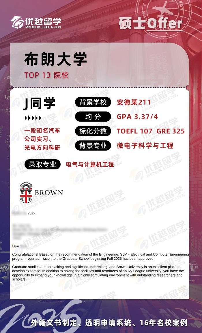 2025重磅offer來襲!恭喜J同學在美國碩士留學申請中成功錄取布朗大學點球計算機工程專業!