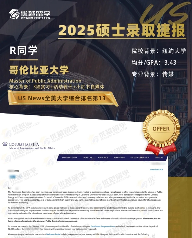 25fall重磅offer來襲!恭喜優越學員在2025spring順利斬獲美國top30名校哥倫比亞大學錄取,一起來看看offer詳情吧!